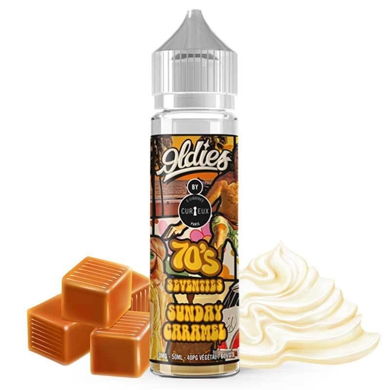 Enfilez vos plus belles bottes, vos robes à fleurs et vos pantalons pattes d'éléphant, Curieux vous emmène faire un tour dans les années 70 avec son e-liquide Seventies Oldies ! Aussi délicieux que dans les dinners américains, redécouvrez l'indémodable sundae, une glace onctueuse et aérienne comme un nuage, recouverte d'un généreux coulis de caramel... Délicieux !